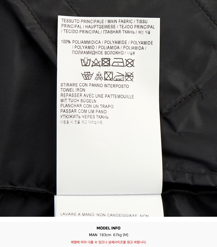 온도 30℃ 에서 손세탁만, 염소표백금지, 온도 110 ℃ 다림질, 스팀처리 금지, 드라이클리닝 금지, 기계 건조 금지